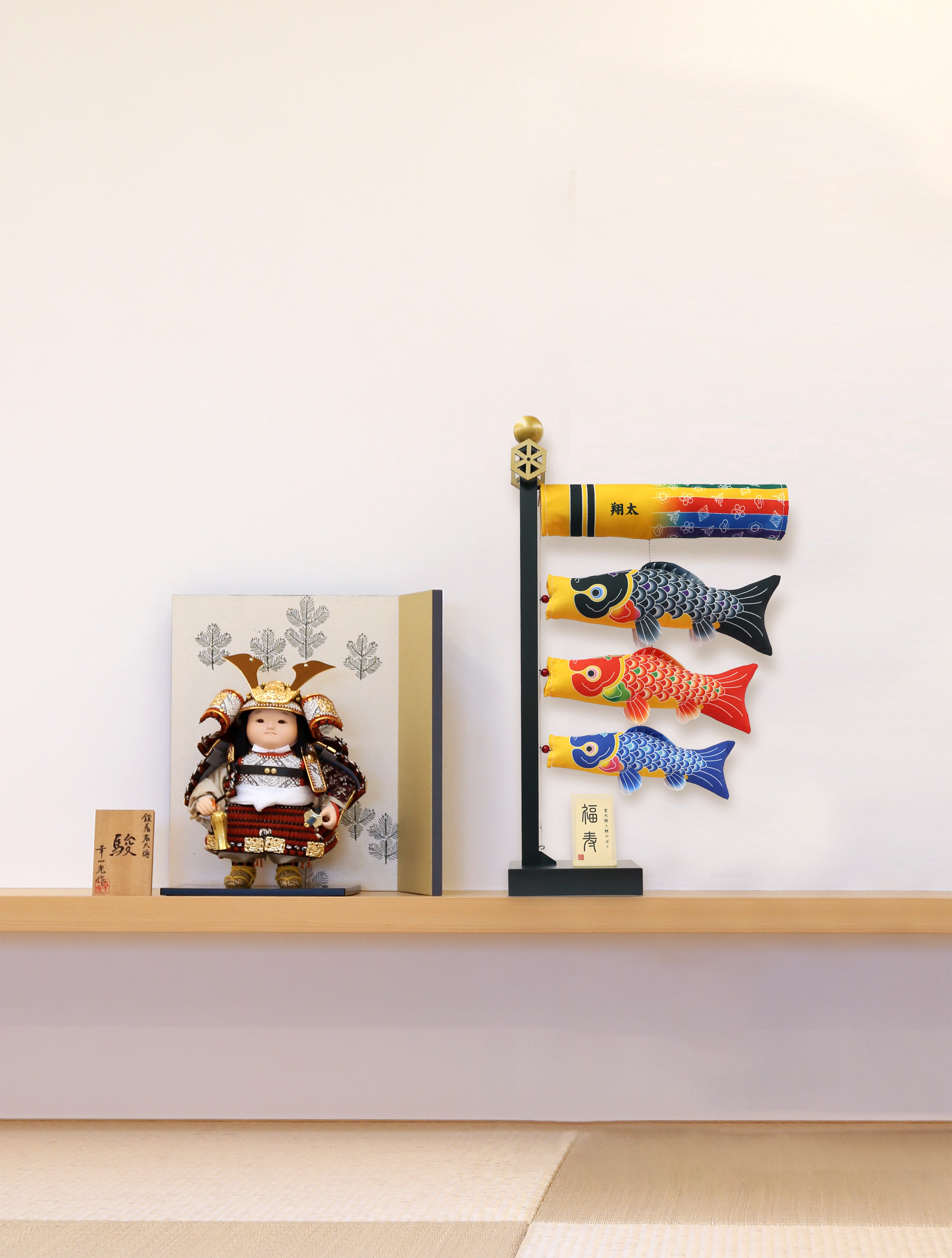 「五月人形」と「鯉のぼり」の端午の節 句の飾りは、「お家の中と外」に飾り男の子の無事と成長を祈願する風習として現代も引き継がれています、このような意味あいからも内飾りの「鎧や兜」外飾りの「鯉のぼり」合わせてお飾りすることが大切なのです。